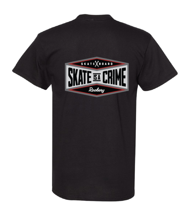 The ROOKERY Crime Tee (Black) is an iconic t-shirt that proudly proclaims the rebellious spirit of skate culture. Its "Skate is a Crime" graphic, printed large on the back in a vintage badge style, pays homage to the time when skating in the city was almost considered a crime. The small logo on the front of the chest maintains a clean and balanced look, while the black background perfectly highlights the gray, white, and red contrasts of the design.