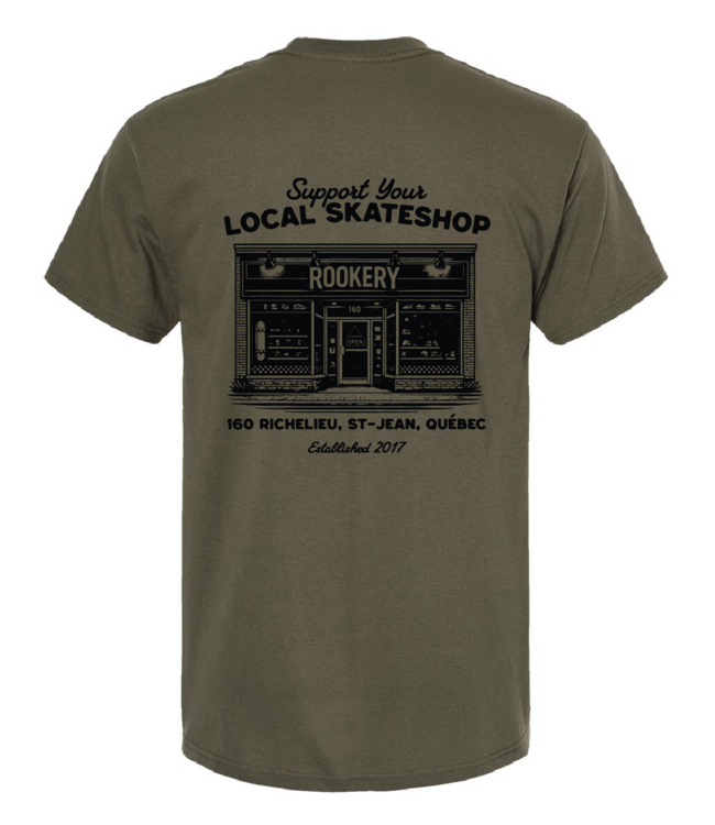 The ROOKERY Façade Tee (Army) is a direct homage to the true roots of skateboarding: the local skateshop, the community, and the neighborhood history. With its detailed graphic of the Rookery façade on the back and the message "Support Your Local Skateshop," this tee perfectly embodies the independent and authentic spirit of skateboarding. Made from comfortable cotton with a regular fit, it's perfect for both the skatepark and everyday wear, on its own or under a shirt or hoodie.